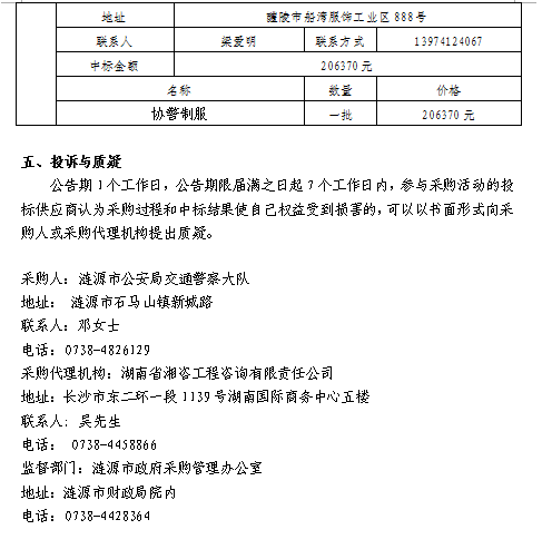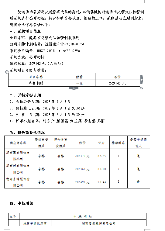 漣源市交警大隊協(xié)警制服采購中標結果公告