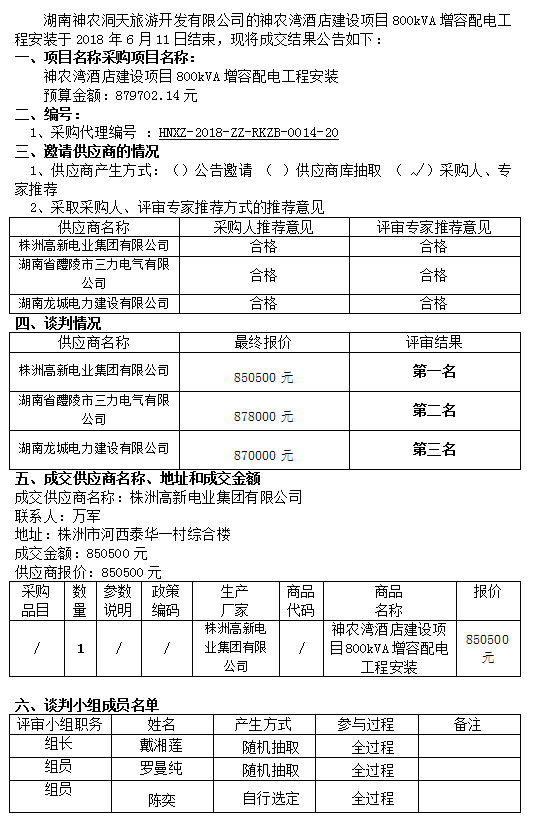 神農(nóng)灣酒店建設(shè)項(xiàng)目800kVA增容配電工程安裝  競爭性談判成交公告