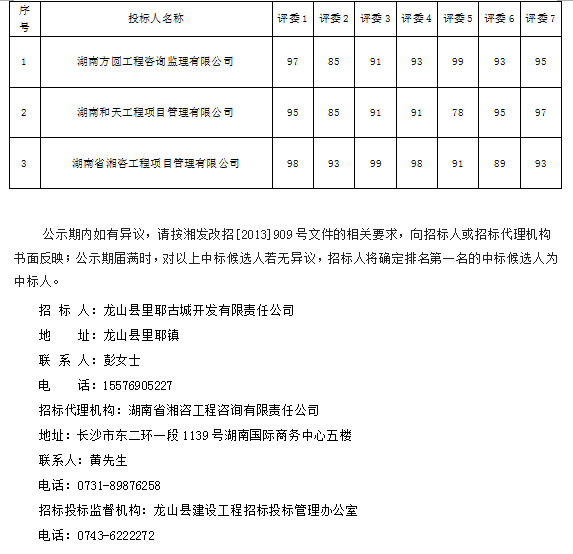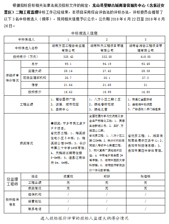 龍山縣里耶古城南游客服務中心(含拆遷安置區(qū))二期工程監(jiān)理 招標投標信息公示表