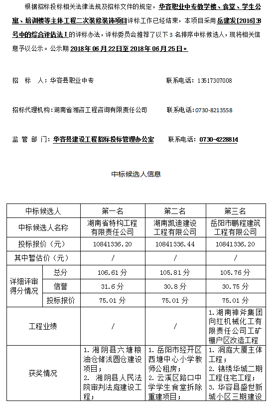 華容職業(yè)中專教學(xué)樓、食堂、學(xué)生公寓、培訓(xùn)樓等主體工程二次裝修裝飾項目中標候選人公示