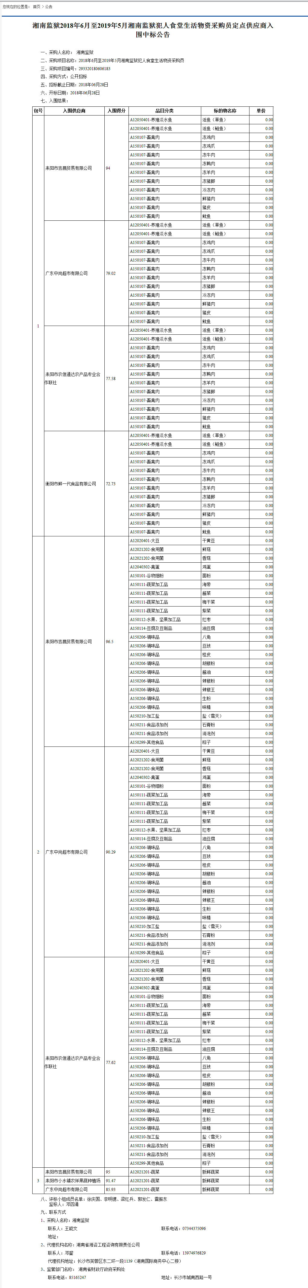 湘南監(jiān)獄2018年6月至2019年5月湘南監(jiān)獄犯人食堂生活物資采購員定點供應(yīng)商入圍中標公告