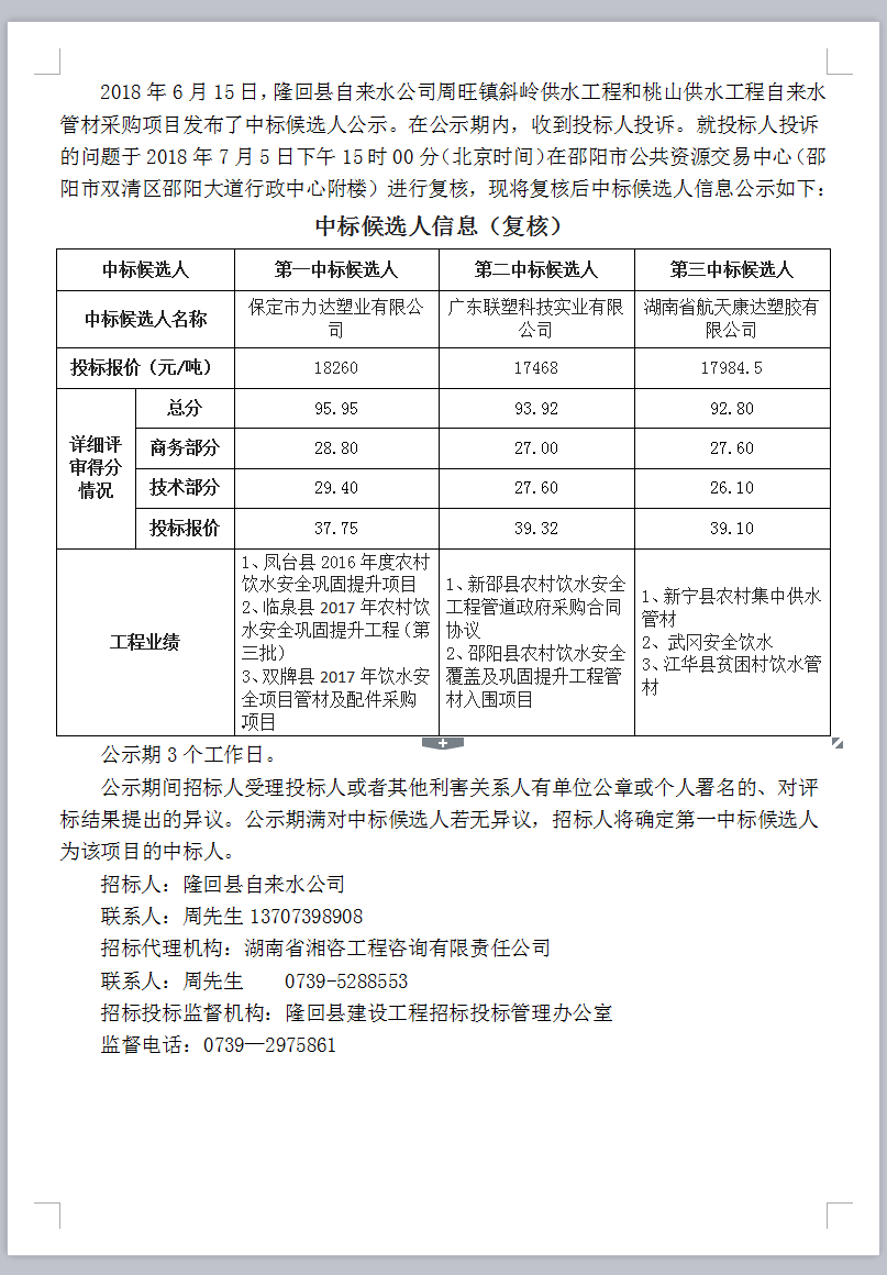隆回縣自來(lái)水公司周旺鎮(zhèn)斜嶺供水工程和桃山供水工程自來(lái)水管材采購(gòu)項(xiàng)目招標(biāo)投標(biāo)信息公示表(復(fù)核)