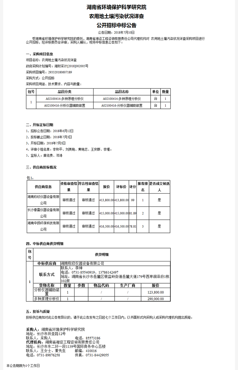 湖南省環(huán)境保護科學(xué)研究院農(nóng)用地土壤污染狀況詳查公開招標(biāo)中標(biāo)公告