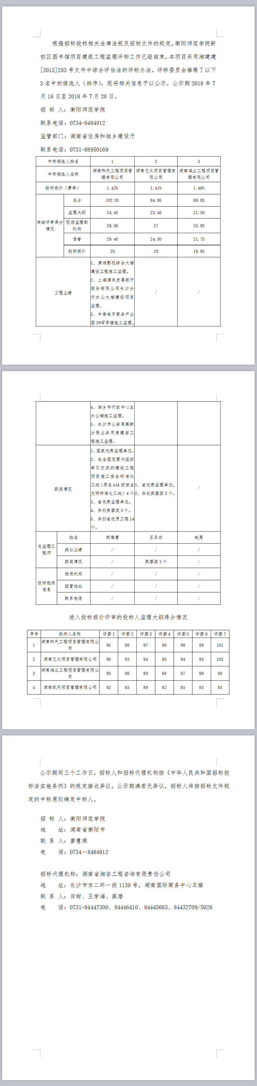 衡陽師范學(xué)院新校區(qū)圖書館項目建筑工程監(jiān)理招標(biāo)投標(biāo)信息公示表