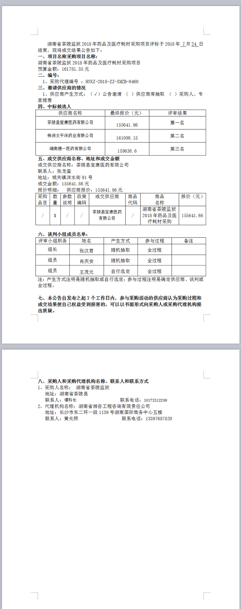 湖南省茶陵監(jiān)獄2018年藥品及醫(yī)療耗材采購項(xiàng)目成交公告