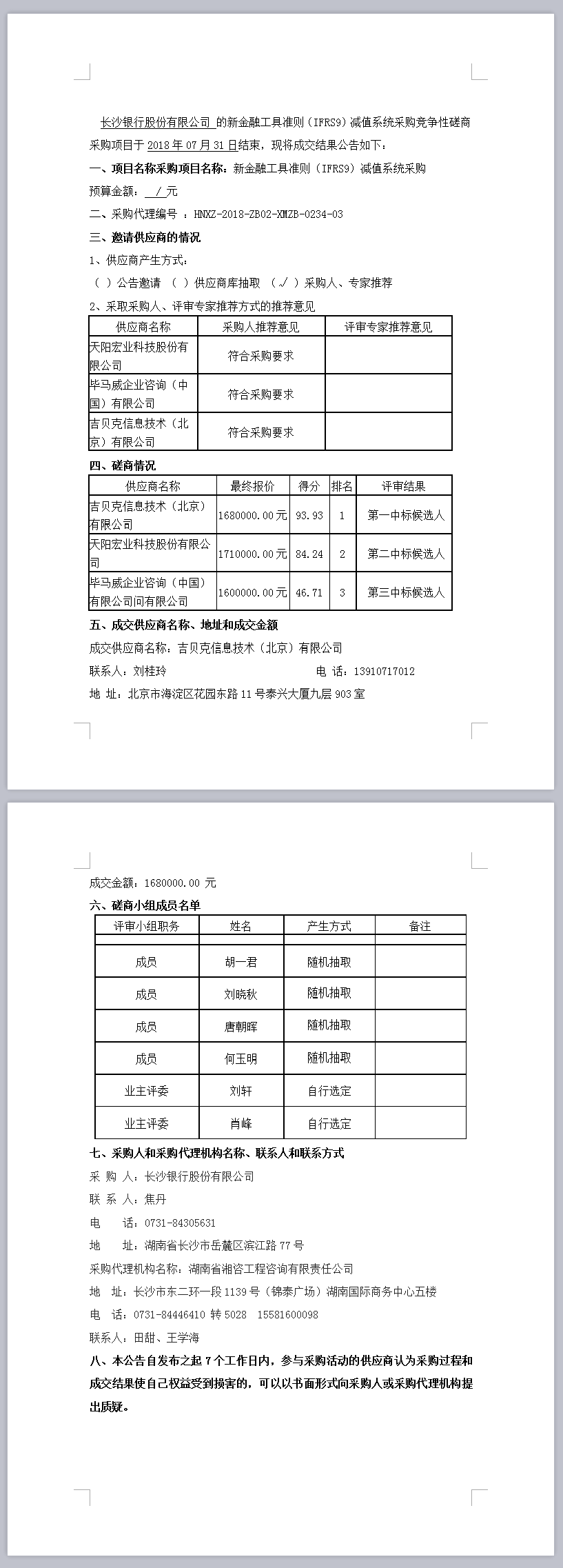 新金融工具準(zhǔn)則(IFRS9)減值系統(tǒng)采購競爭性磋商成交公告