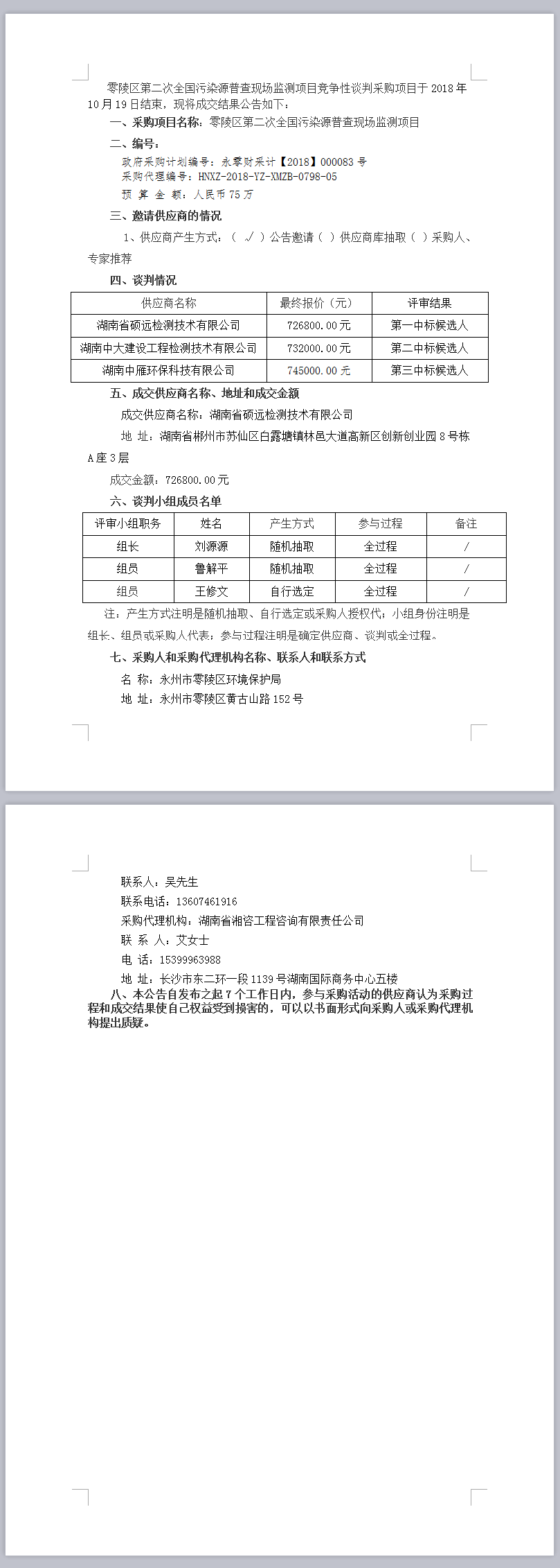 零陵區(qū)第二次全國(guó)污染源普查現(xiàn)場(chǎng)監(jiān)測(cè)項(xiàng)目競(jìng)爭(zhēng)性談判成交公告