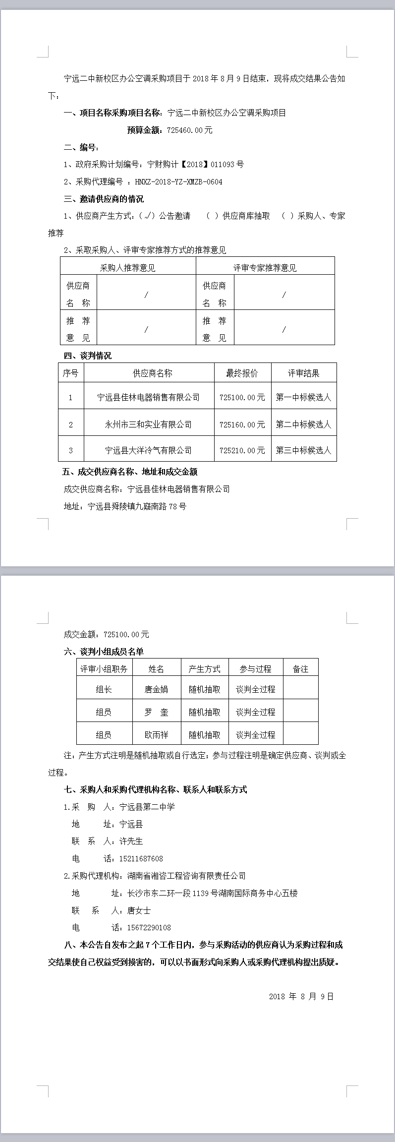 寧遠(yuǎn)二中新校區(qū)辦公空調(diào)采購項目競爭性談判成交結(jié)果公告