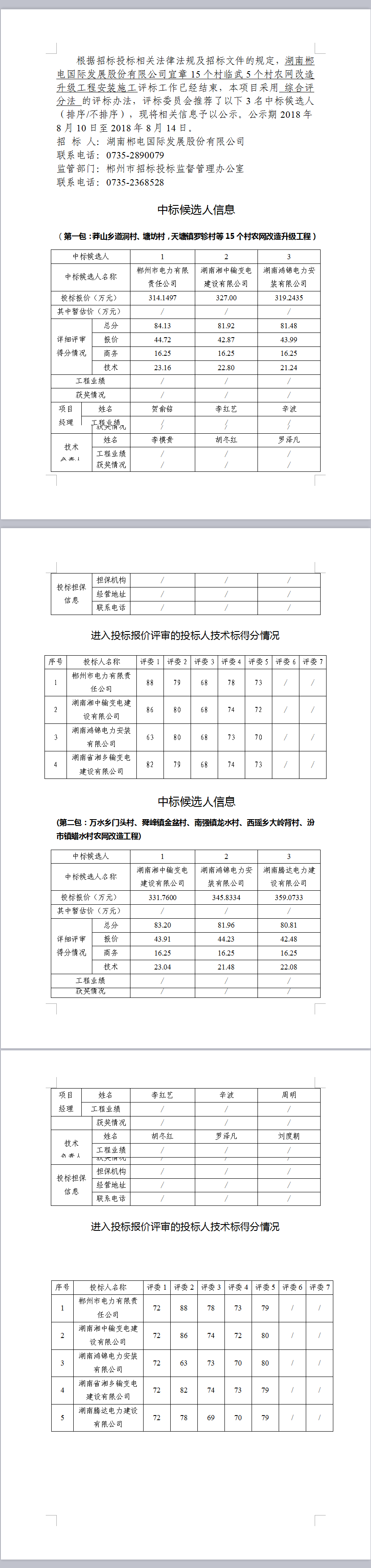 湖南郴電國際發(fā)展股份有限公司宜章15個(gè)村臨武5個(gè)村農(nóng)網(wǎng)改造升級工程安裝施工中標(biāo)候選人公示