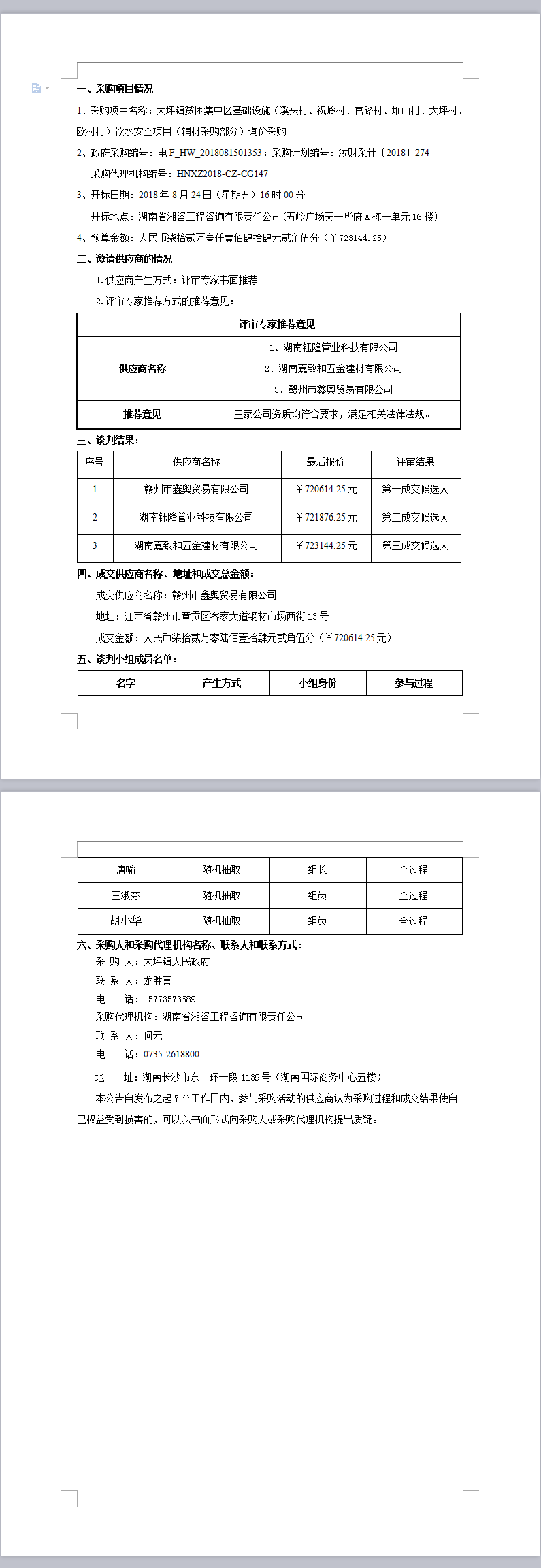 大坪鎮(zhèn)貧困集中區(qū)基礎設施(溪頭村、祝嶺村、官路村、堆山村、大坪村、歐村村)飲水安全項目(輔材采購部分)詢價采購成交公告