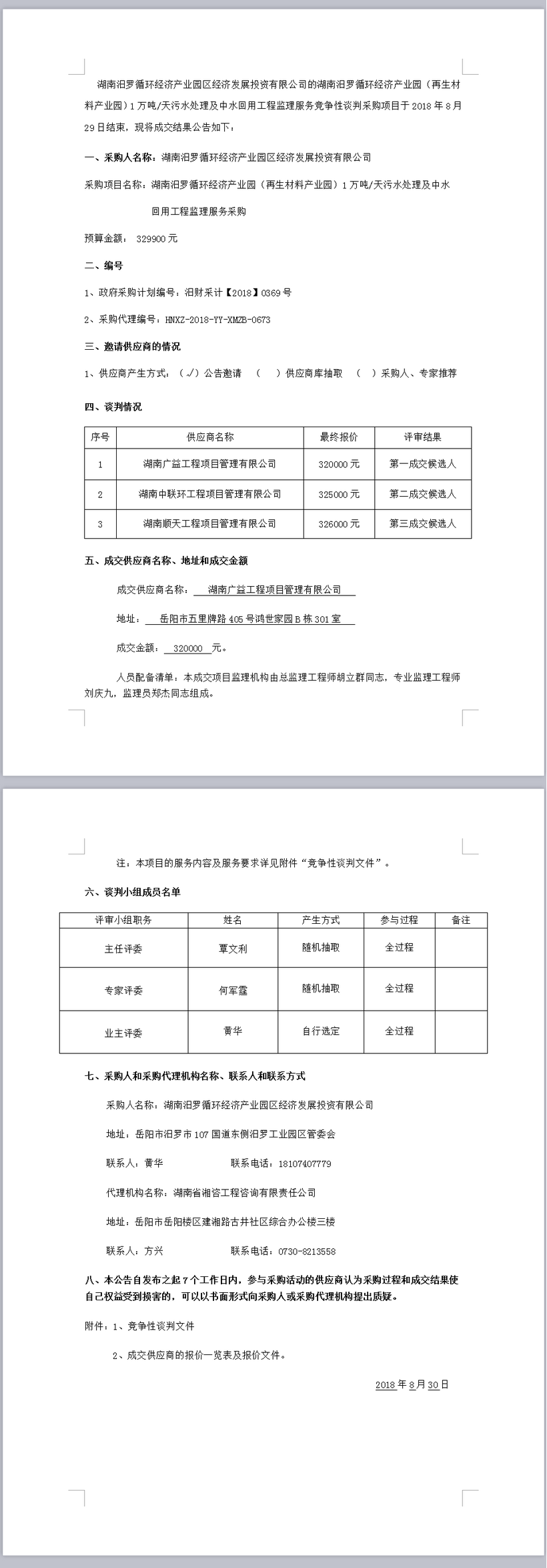 湖南汨羅循環(huán)經(jīng)濟(jì)產(chǎn)業(yè)園(再生材料產(chǎn)業(yè)園)1萬噸/天污水處理及中水回用工程監(jiān)理服務(wù)政府采購項(xiàng)目競爭性談判成交結(jié)果公告