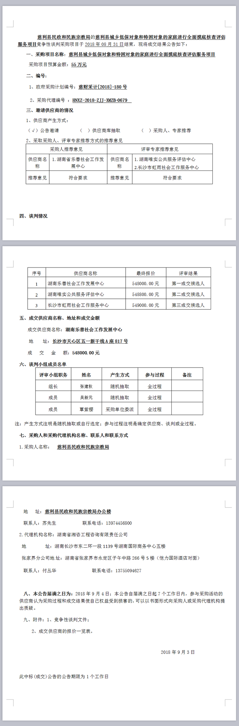 慈利縣城鄉(xiāng)低保對象和特困對象的家庭進行全面摸底核查評估服務項目談判成交公告