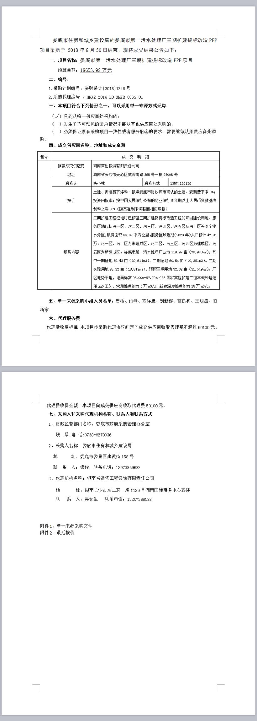 婁底市第一污水處理廠三期擴(kuò)建及提標(biāo)改造PPP項(xiàng)目單一來源成交公告