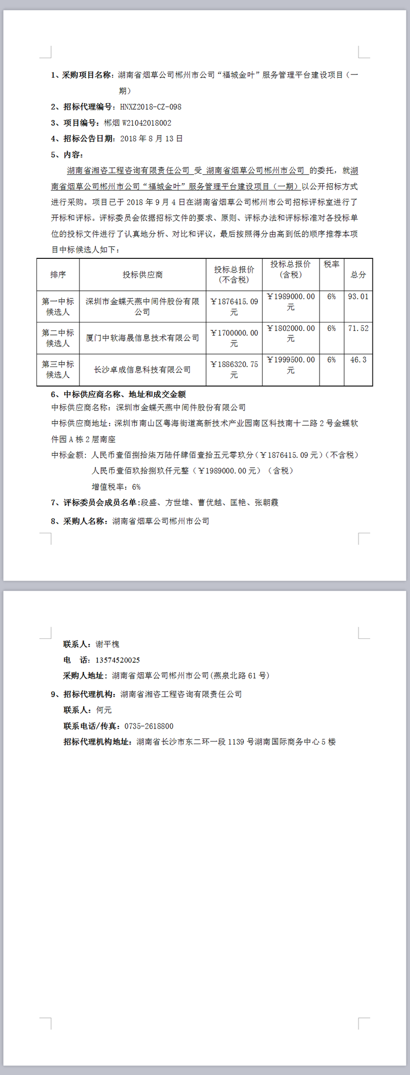 湖南省煙草公司郴州市公司“福城金葉”服務管理平臺 建設項目(一期)中標結果公示