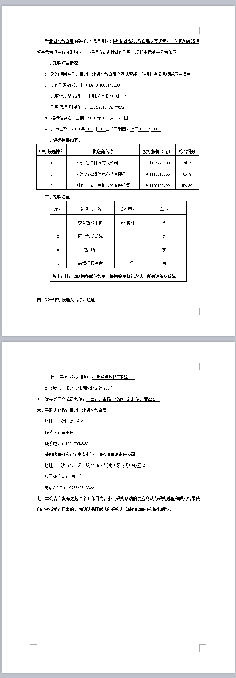 郴州市北湖區(qū)教育局交互式智能一體機(jī)和高清視頻展示臺(tái)項(xiàng)目政府采購(gòu)評(píng)標(biāo)結(jié)果公示