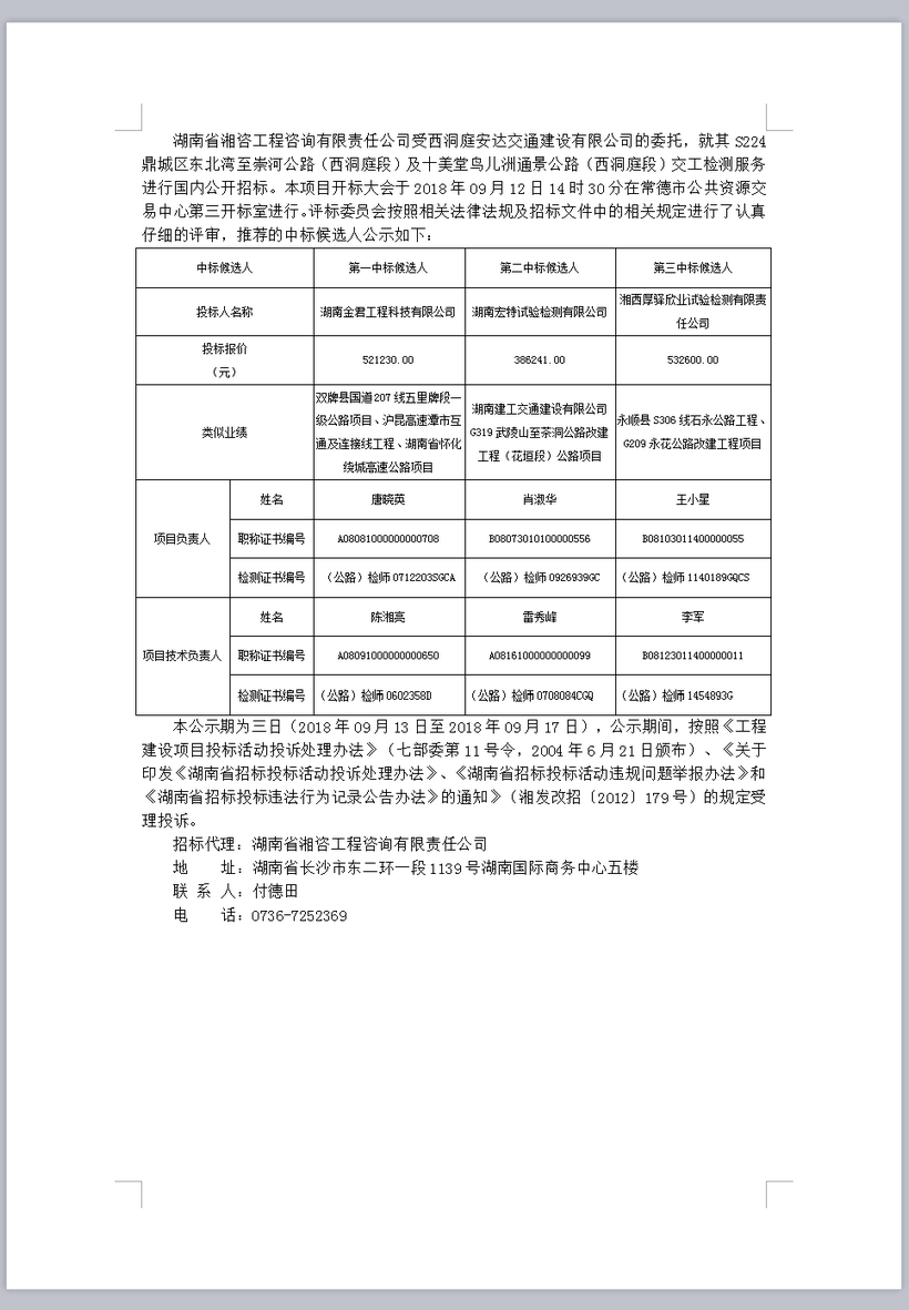 S224鼎城區(qū)東北灣至崇河公路(西洞庭段)及十美堂鳥兒洲通景公路(西洞庭段)交工檢測服務(wù)中標(biāo)候選人公示