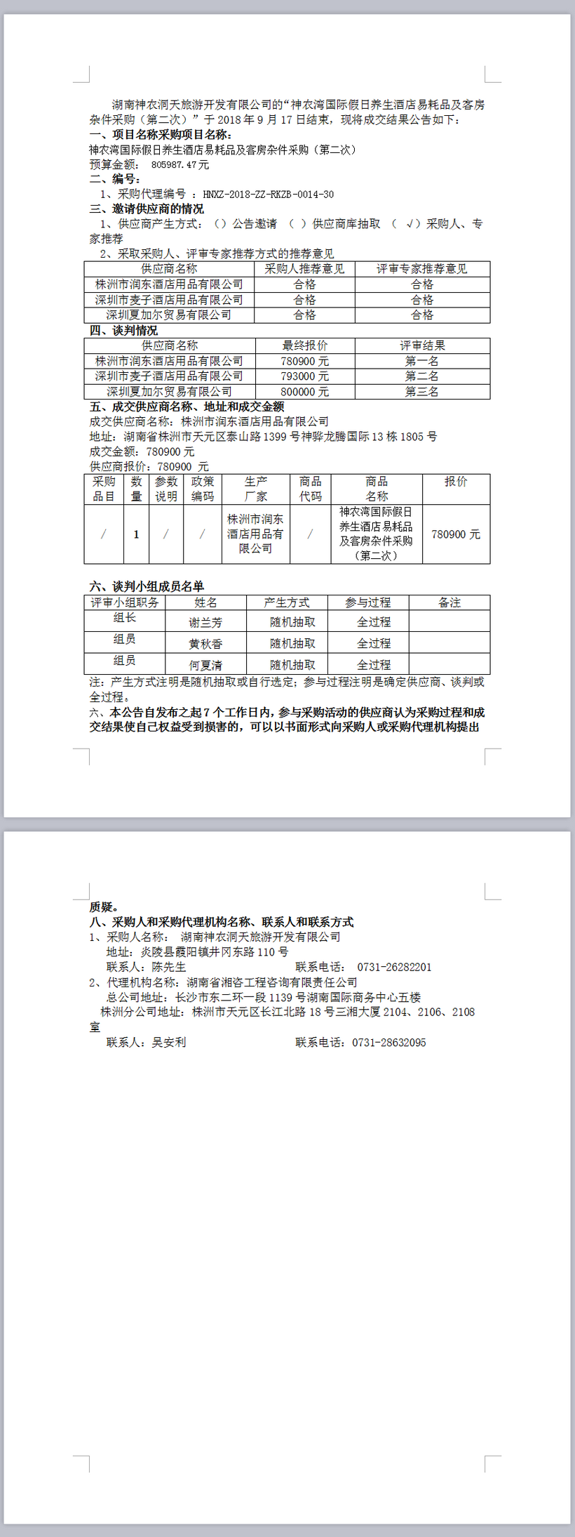 神農(nóng)灣國(guó)際假日養(yǎng)生酒店易耗品及客房雜件采購(gòu)(第二次)競(jìng)爭(zhēng)性談判成交公告
