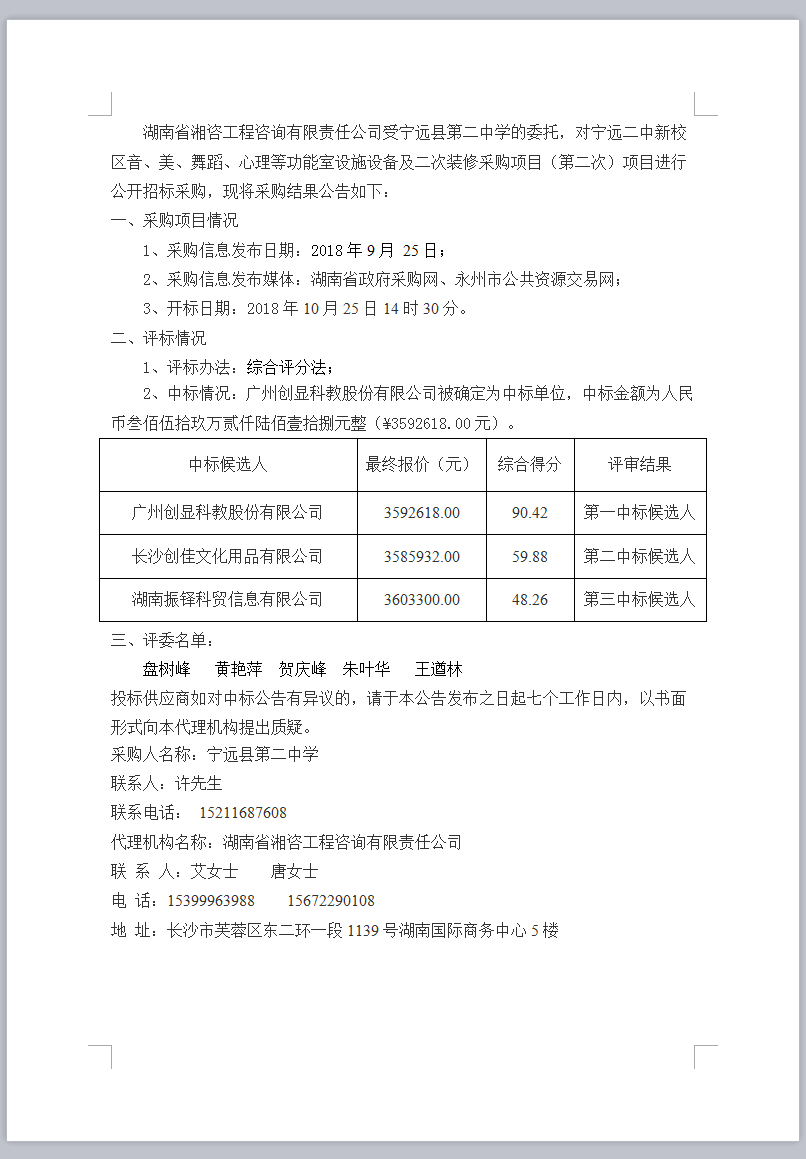 寧遠二中新校區(qū)音、美、舞蹈、心理等功能室設施設備及二次裝修采購項目中標公告