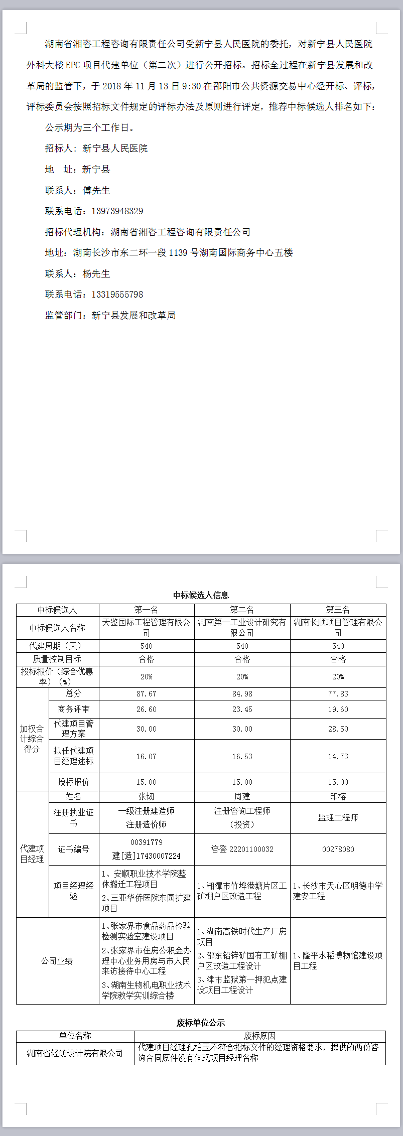 新寧縣人民醫(yī)院外科大樓EPC項(xiàng)目代建單位(第二次) 招標(biāo)投標(biāo)信息公示表