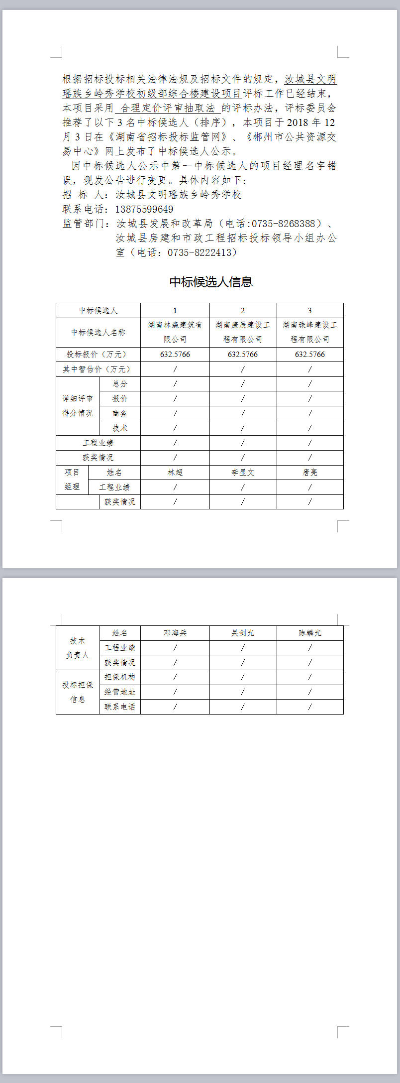 汝城縣文明瑤族鄉(xiāng)嶺秀學(xué)校初級(jí)部綜合樓建設(shè)項(xiàng)目中標(biāo)候選人公示(變更)
