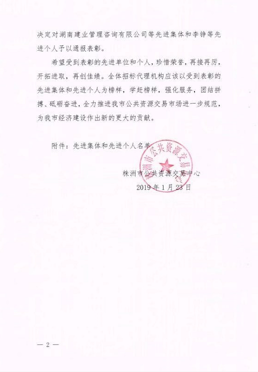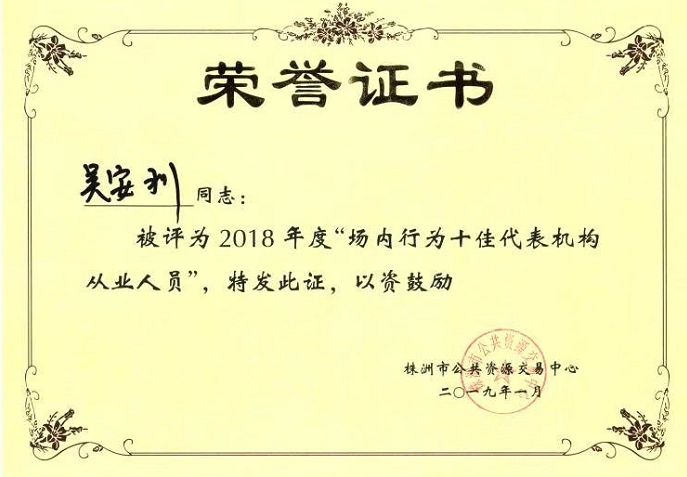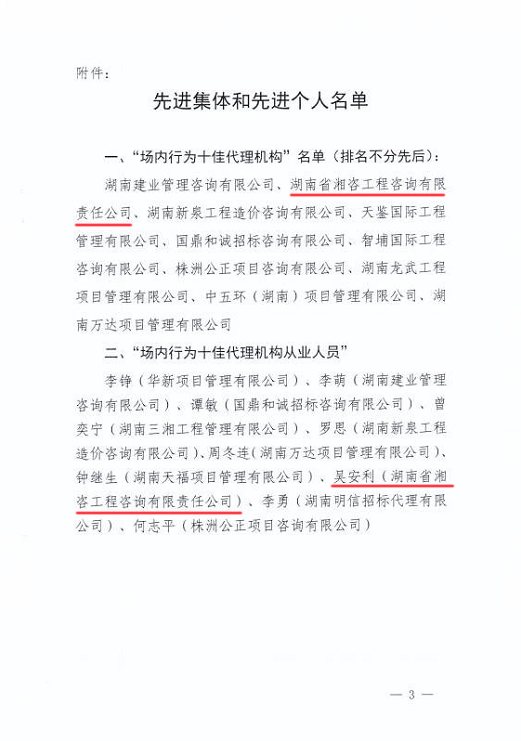 湖南省湘咨工程咨詢有限責(zé)任公司吳安利被評(píng)為株洲市公共資源交易中心“場(chǎng)內(nèi)行為十佳代理機(jī)構(gòu)從業(yè)人員”先進(jìn)個(gè)人。