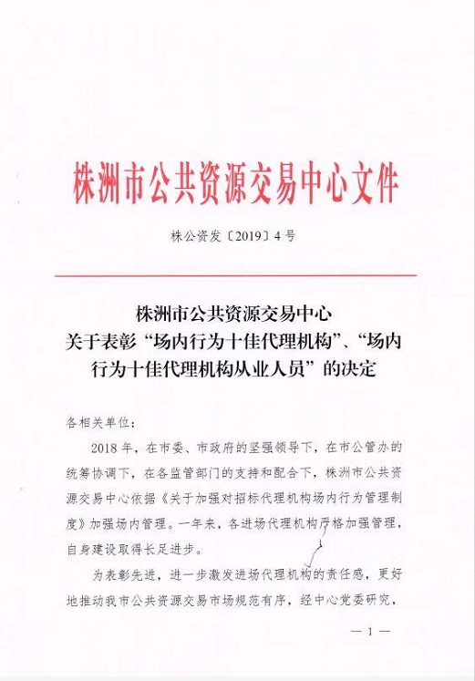 湖南省湘咨工程咨詢有限責(zé)任公司被評(píng)為株洲市公共資源交易中心“場(chǎng)內(nèi)行為十佳代理機(jī)構(gòu)”先進(jìn)集體。
