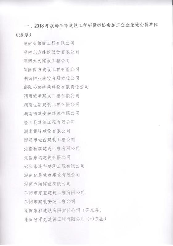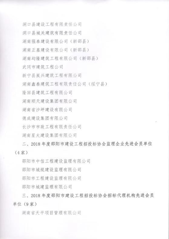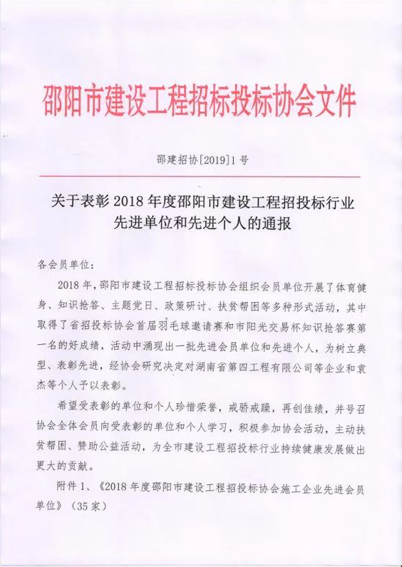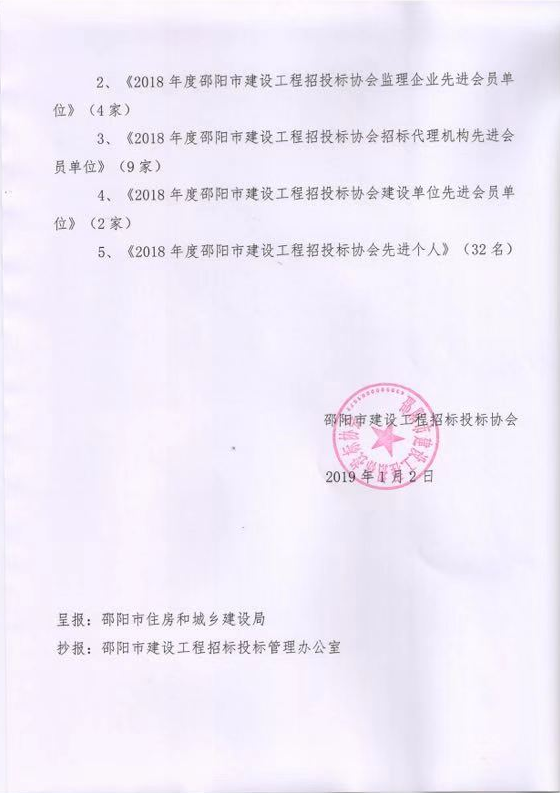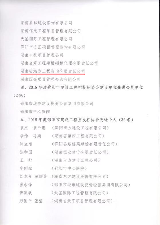 湖南省湘咨工程咨詢有限責(zé)任公司被邵陽市建設(shè)工程招標(biāo)投標(biāo)協(xié)會(huì)評(píng)為“2018年度邵陽市建設(shè)工程招投標(biāo)行業(yè)”先進(jìn)單位。