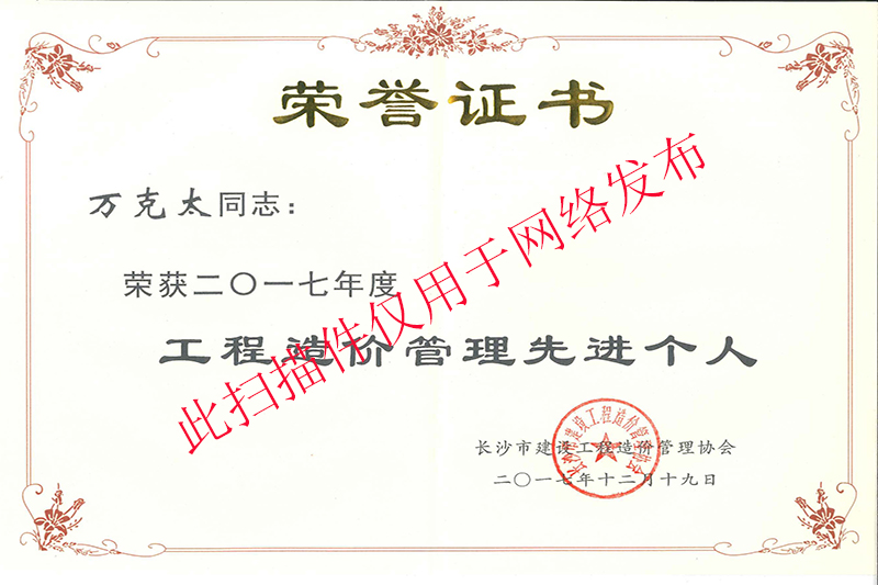 造價(jià)一部經(jīng)理、注冊(cè)造價(jià)工程師萬(wàn)克太同志榮獲長(zhǎng)沙市建設(shè)工程造價(jià)管理協(xié)會(huì)頒發(fā)的2017年度工程造價(jià)管理先進(jìn)個(gè)人稱(chēng)號(hào)。