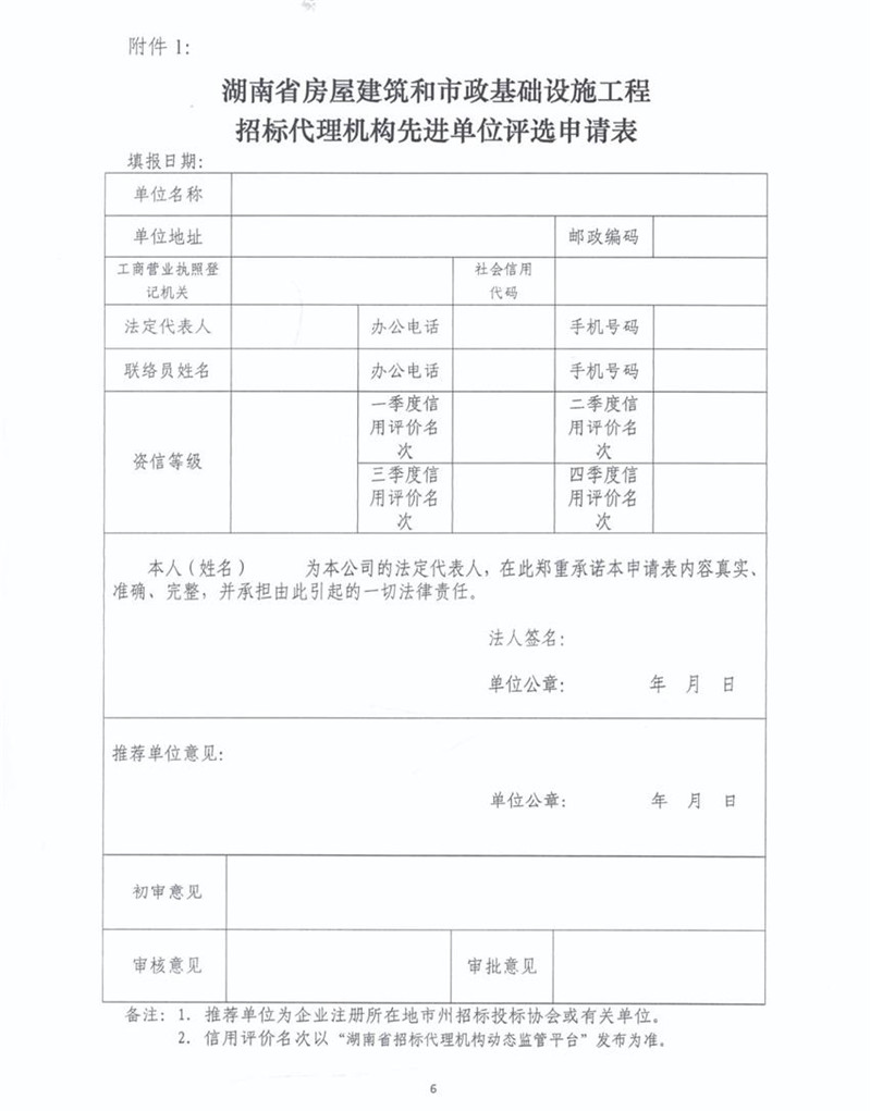 附件1:湖南省房屋建筑和市政基礎設施工程招標代理機構先進單位評選申請表