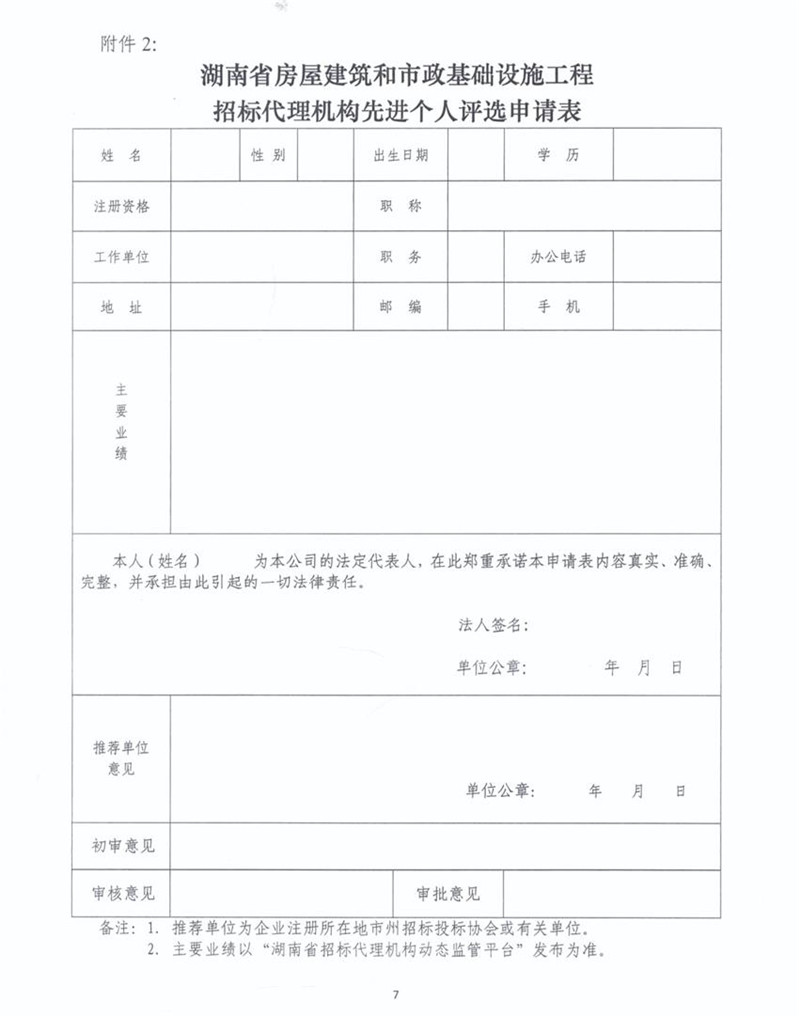 附件2:湖南省房屋建筑和市政基礎設施工程招標代理機構先進個人評選申請表