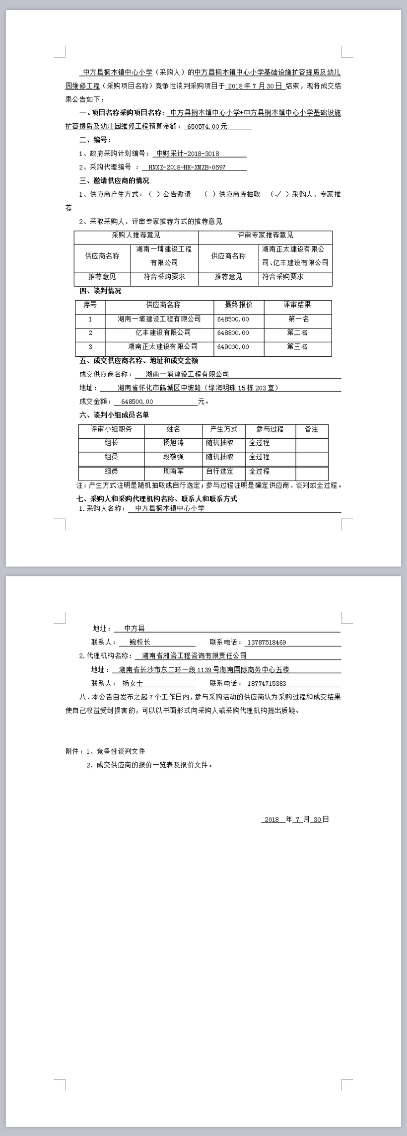 中方縣桐木鎮(zhèn)中心小學(xué)+中方縣桐木鎮(zhèn)中心小學(xué)基礎(chǔ)設(shè)施擴(kuò)容提質(zhì)及幼兒園維修工程競爭性談判成交結(jié)果公告