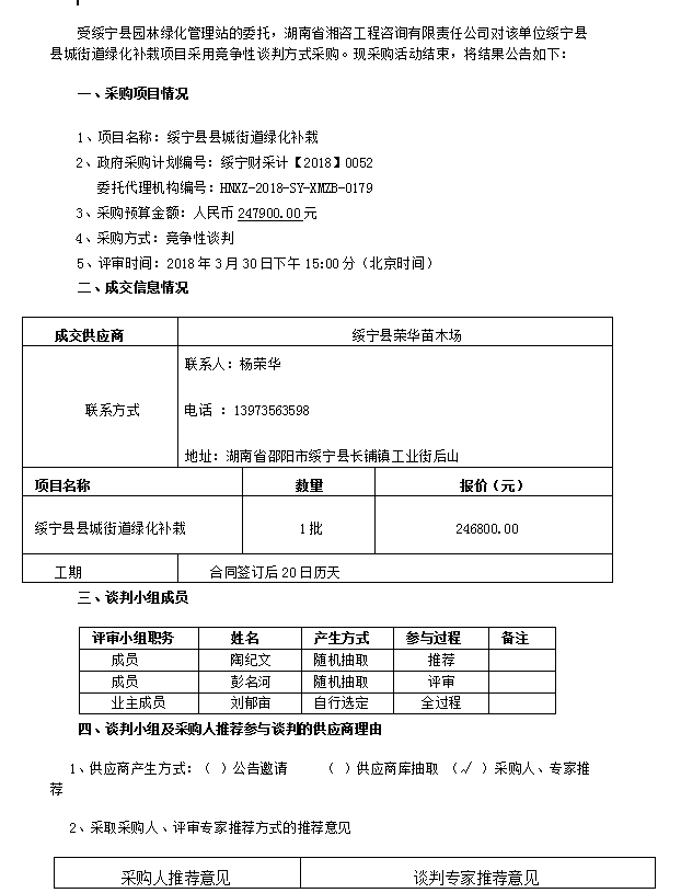 綏寧縣縣城街道綠化補栽項目談判成交公告
