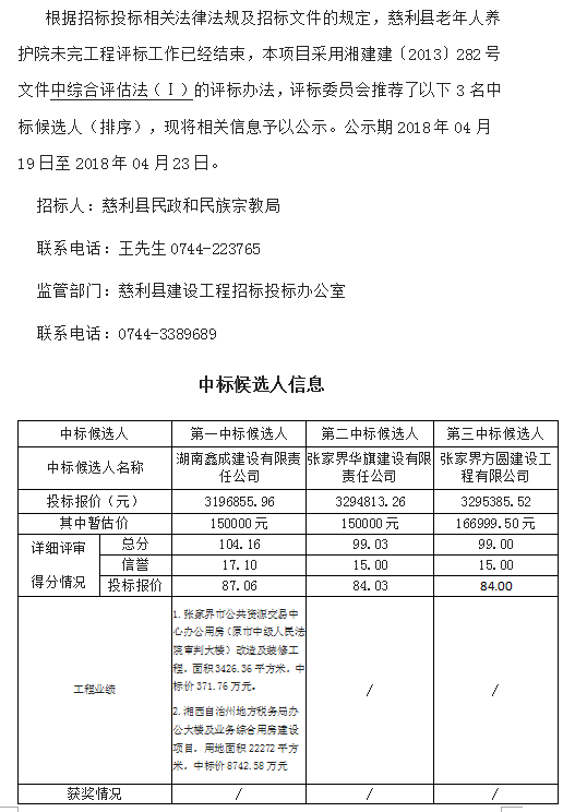慈利縣老年人養(yǎng)護院未完工程施工招標(biāo) 中標(biāo)候選人公示