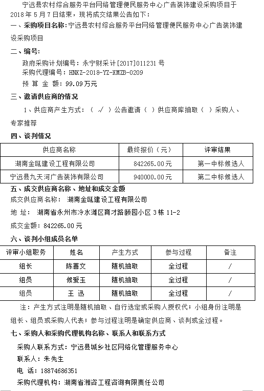 寧遠(yuǎn)縣農(nóng)村綜合服務(wù)平臺網(wǎng)絡(luò)管理便民服務(wù)中心廣告裝飾建設(shè)采購項(xiàng)目競爭性談判成交公告