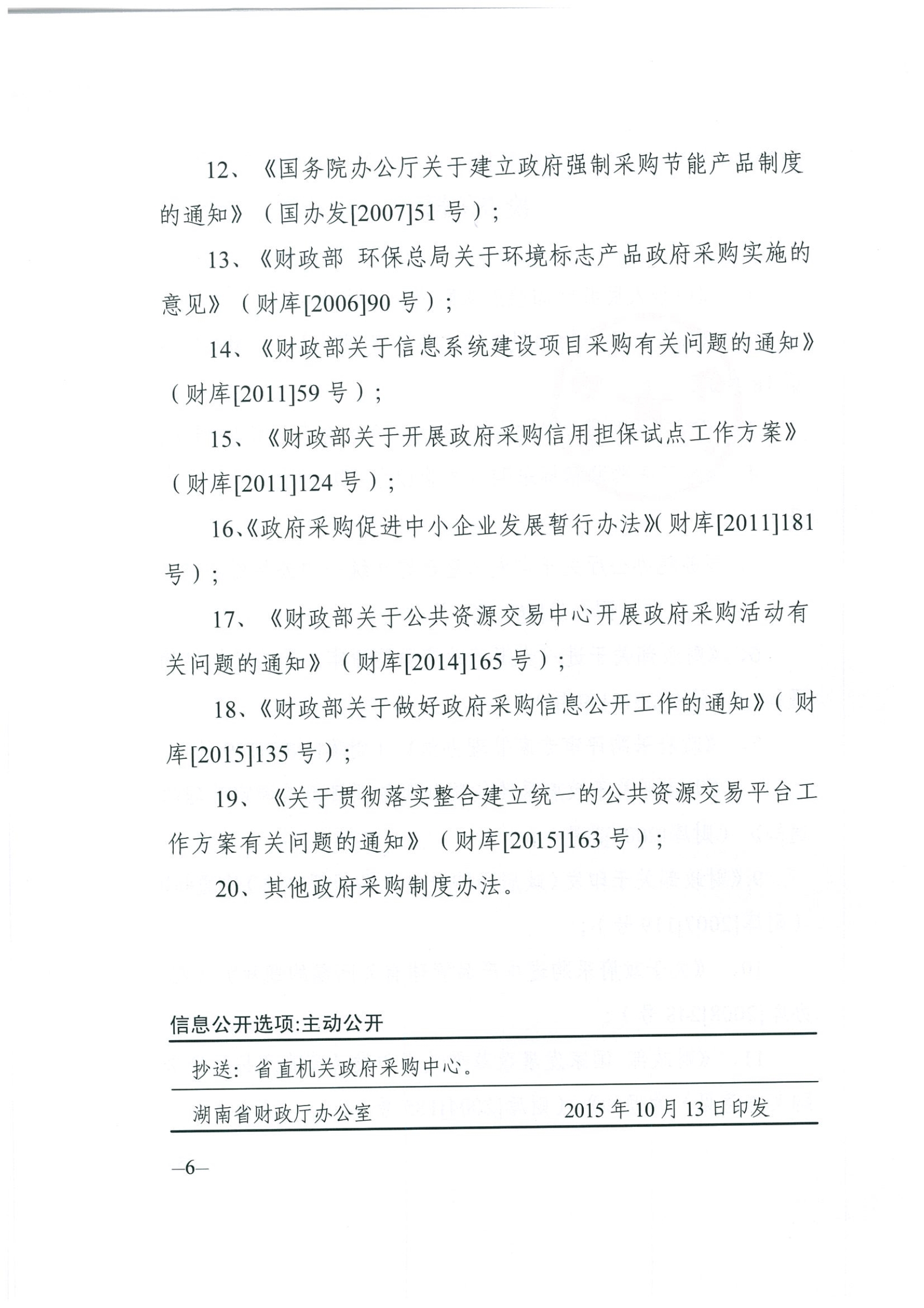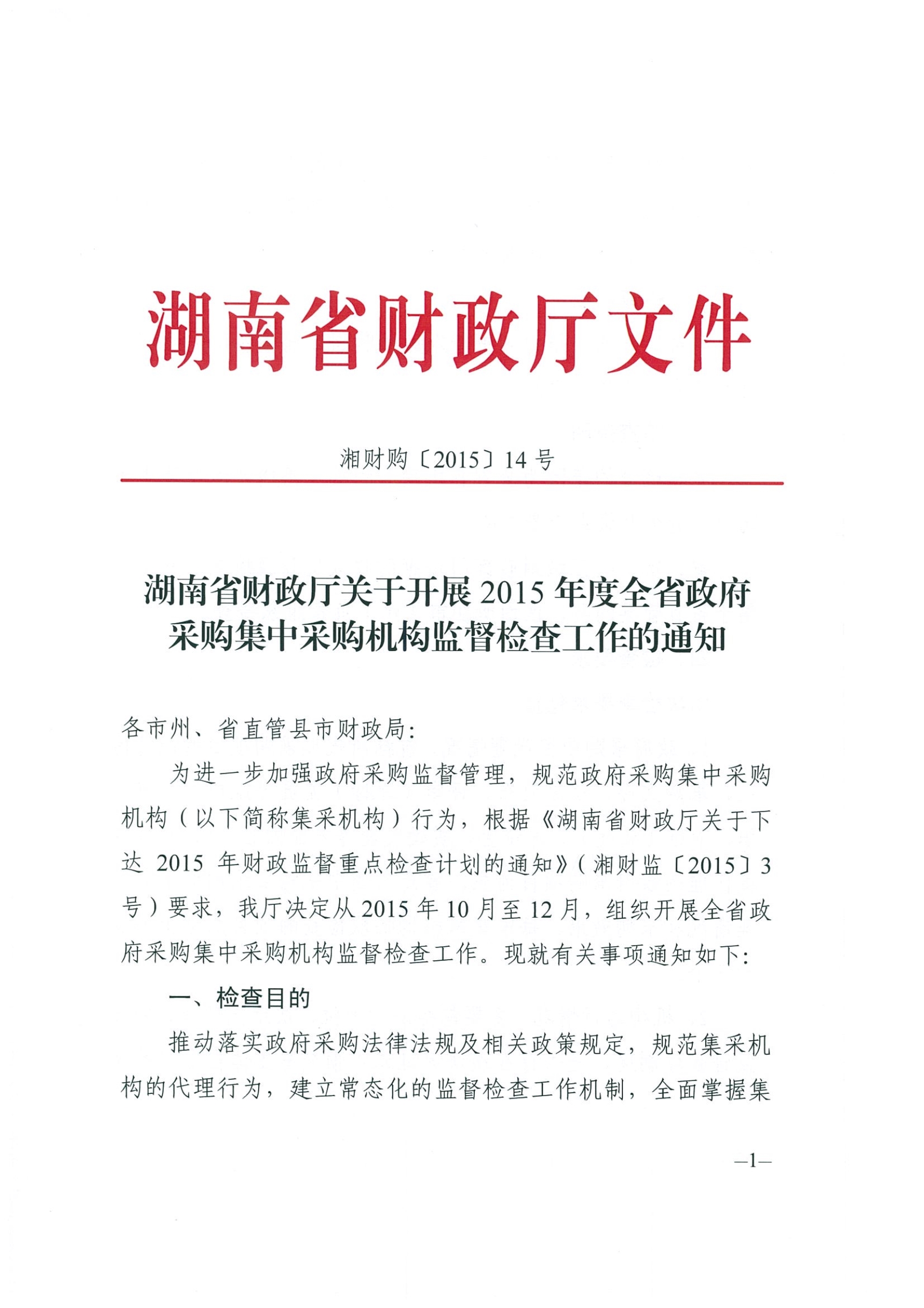湖南省財政廳關(guān)于開展2015年度全省政府采購集中采購機(jī)構(gòu)監(jiān)督檢查工作的通知(湘財購【2015】14號)